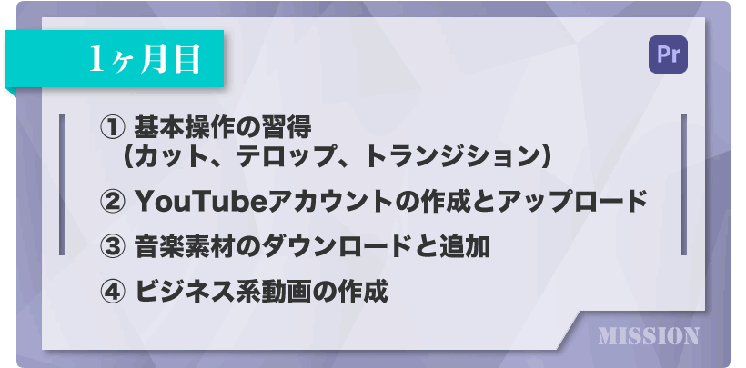 1ヶ月目で、Premiereの基本的な操作方法と動画編集の基本テクニックを身につけて頂きます。
